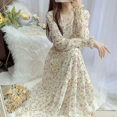 花柄ワンピース 2024 秋 新作 Vネックタイド新秋長袖人気スカート花柄ワンピースミドルレングスモデル
