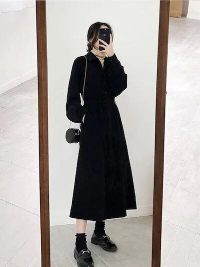 人气 新作 ロングワンピース ブラック ロングスリーブ シャツ ドレス 女性 秋 2024 新しいスタイル