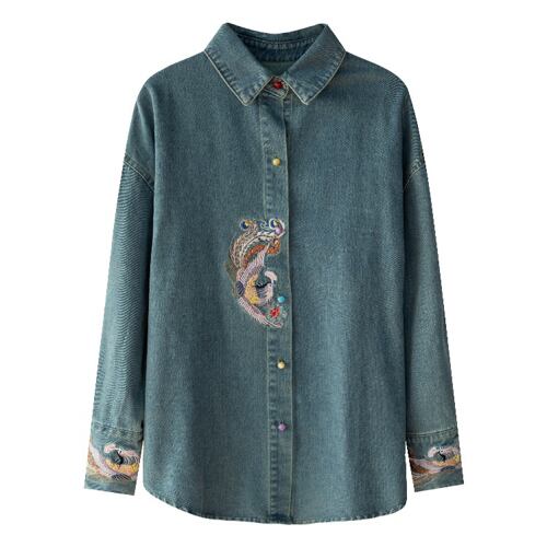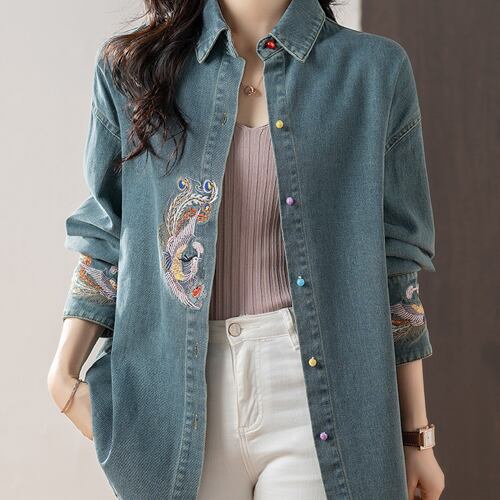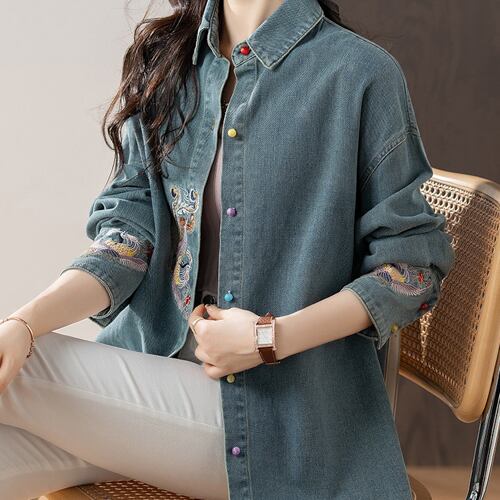 初回送料無料 新作レディースファッション カジュアル ゆったり 刺繍デニムシャツ 人気トップス