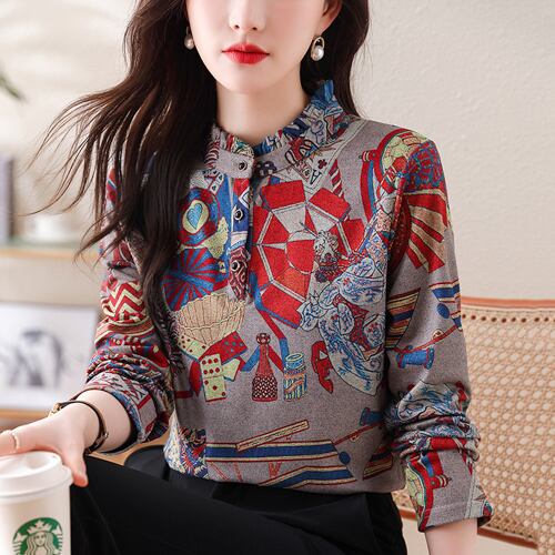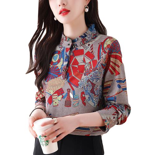 初回送料無料 新作レディースファッション プリント シャツ風 スタンドカラー 長袖トップス