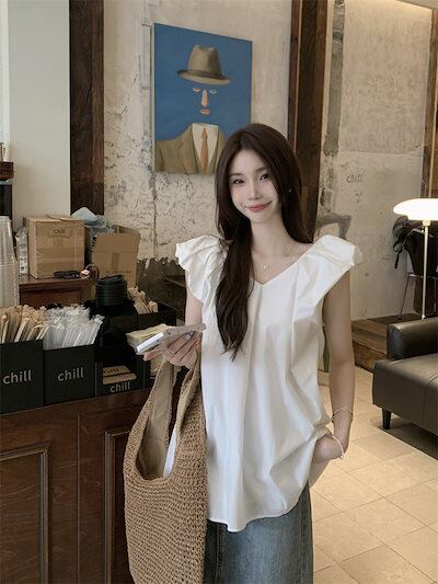 2024夏トップス シャツ リボン 半袖 Vネック 丈長め ゆったり 細見え 夏 白 黒 おしゃれ かわいい ガーリー キュート 甘め 韓国ファッション レディース お出かけ