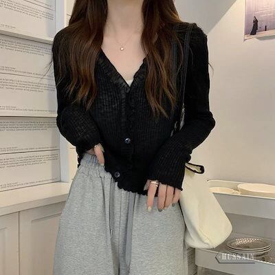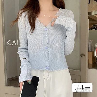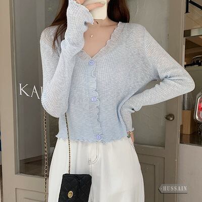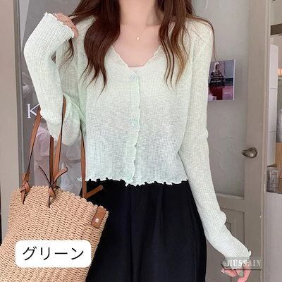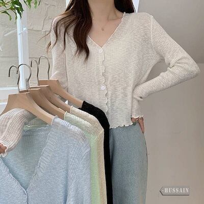 2024 夏 韓国 ライトニット カーディガン トップス 羽織り加工 ショート 薄手 長袖 紫外線対策 UV対策 きれいめ オフィス OLネックカジュアルフレンチフェミニンファッション韓国 レディース