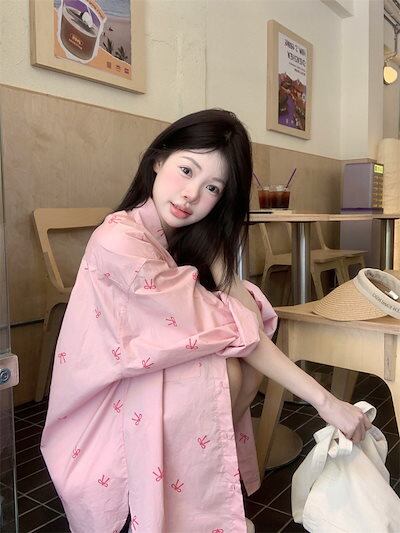 2024夏トップス シャツ リボン ボタン 長袖 丈長め ゆったり 細見え 夏 ピンク おしゃれ かわいい ガーリー キュート 甘め 韓国ファッション レディース お出かけ