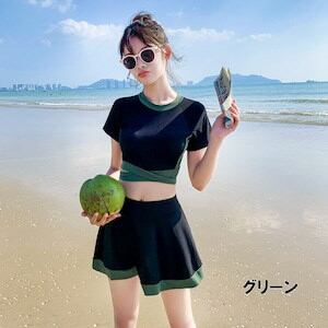 2024 2色 タンキニ ビキニ レディース 黒 バイカラー 体型カバー 水着 袖あり スカート スポーティー S M L XL 韓国 水着 上下セット セパレート カジュアル ミニスカート 半袖 T