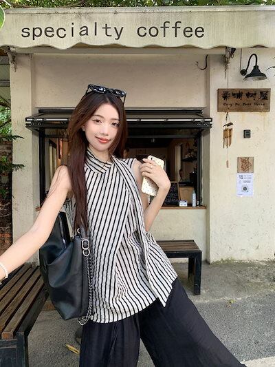 2024夏トップス シャツ ハイネック ストライプ ノースリーブ ゆったり 細見え 夏 黒 ブラック おしゃれ かわいい 大人っぽい 韓国ファッション レディース お出かけ