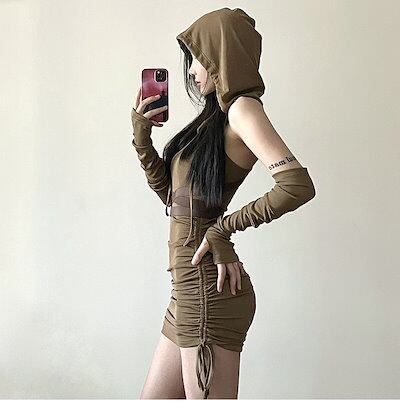 2024春夏 ワンピース フード付き かわいい ミモレ丈 ジャンパースカート キャミソール フロントオープン アーム春秋 韓国系ファッション レディース おしゃれ かわいい