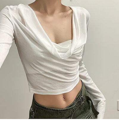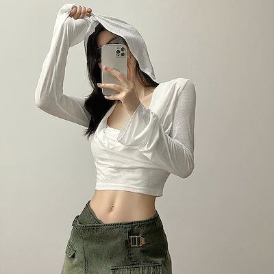 2024 春夏 フード付き tシャツ ファッション トップス 薄手 韓国系 長袖 秋 白 ソリッドカラー シャツスリムトップパイル襟日焼け止めシャツ肌見せ 女っぽ フレンチタイト丈 レディース T