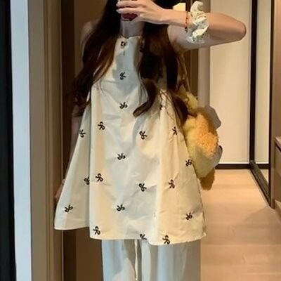 2024夏 韓国トップス シャツ ラウンドネック リボン ノースリーブ ゆったり 細見え 夏 白 ホワイト おしゃれ かわいい キュート ガーリー 甘め 韓国ファッション レディース お出かけ