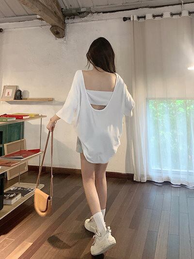2024夏 韓国トップス シャツ 五分袖 バックオープン ゆったり 細見え 夏 白 黒 大人っぽい おしゃれ かわいい 韓国ファッション レディース お出かけ