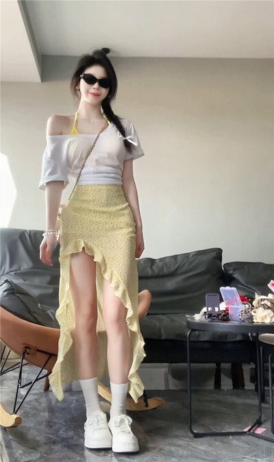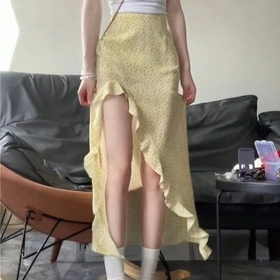 2024 春夏スカート ミモレ丈 Aライン 台形 スリット フリル ハイウエスト 美脚効果 脚長効果 細見え 夏 黄色 イエロー おしゃれ かわいい 韓国ファッション レディース お出かけ