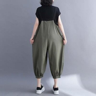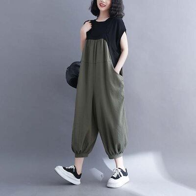 コーデ完成!サロペット 大きいサイズの女性の夏の綿麻の背部ズボンの女性の緩いドローストリング9分ズボン 韓国ファッション