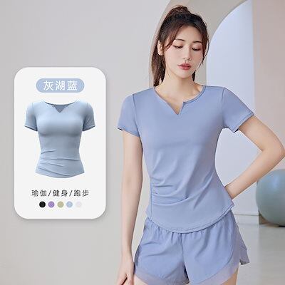 おしゃれヨガウェア お家ヨガウェア Vネック ストレッチ 無地 着痩せ シャーリング ヨガウェア