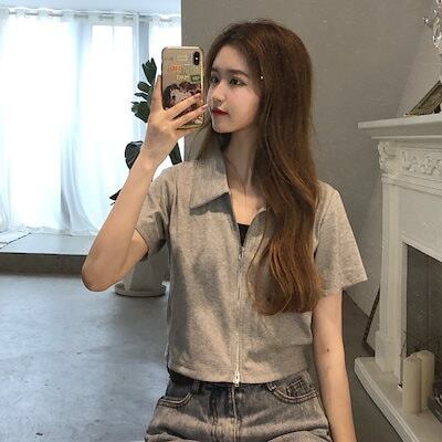 Tシャツ 夏 デザイン感 を出すへそ出し ショート丈 トップス ファスナースリムピュアカラー 半袖 レディース 韓国