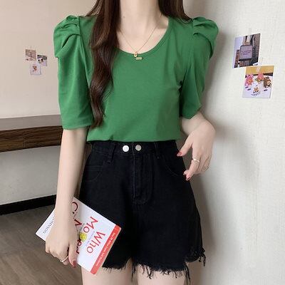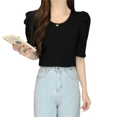 Tシャツ 綿 パフスリーブ 半袖 夏 ins 半袖 トップス 身だしなみ 減齢 洋風 できれい レディース 韓国