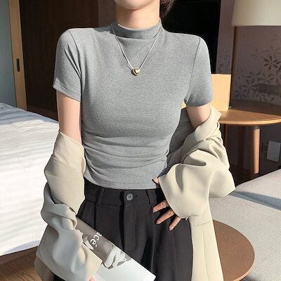 Tシャツ トップス 春夏 ハーフハイネックねじ付き 半袖 新 デザインフィットタイツ レディース 韓国