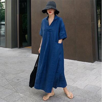 ポケット付きスキッパーリネンワンピース韓国ファッションゆったり レディース リネンワンピース2024春夏新作レディース