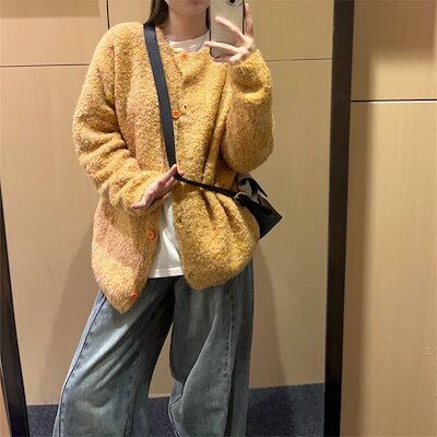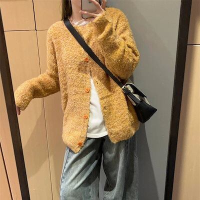 ベーシックニット 甘めモチモチ風ニットゆったりカーディガン女23年秋冬レトロなけだるさ風クルーネックニットコートトップス