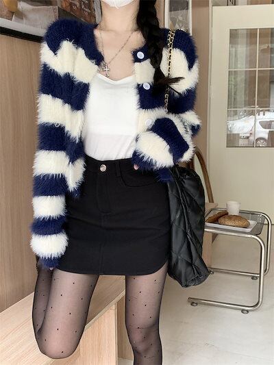 ベーシックニット ぶつけ色ストライプv襟馬海毛ニットカーディガン春冬身だしなみアウターセータージャケットショート丈トップス