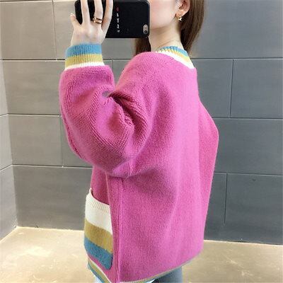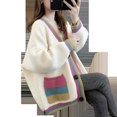 ベーシックニット アウター女2023春秋のけだるさ風Vネックカラーニットゆったり厚手セーターカーディガン