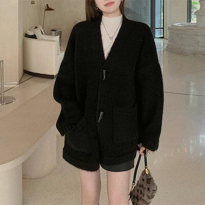 ベーシックニット 優しい風ゆったりVネックニットクロワッサンカーディガン女23年秋冬レトロモチモチポケットセーターコート