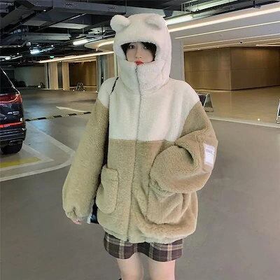 ジャケット クリスマス 韓国ファッション 冬 ブラッシュトップス アウター フード付き お肌に優しい ふわふわ ウォーム キュート 色切り替え ゆったり 厚手 レディース 着やせ 学生