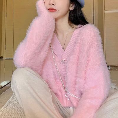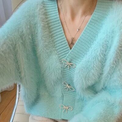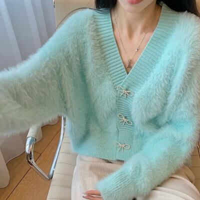 ベーシックニット モチモチフォルムミンクセーターカーディガンコート秋冬リボンデザインショート丈厚手ニットトップス