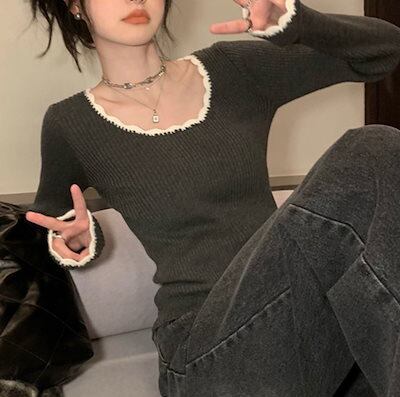 韓国ファッションレディース ベーシックニット 丸ネックコントラストカラー ベーシックニット セーター