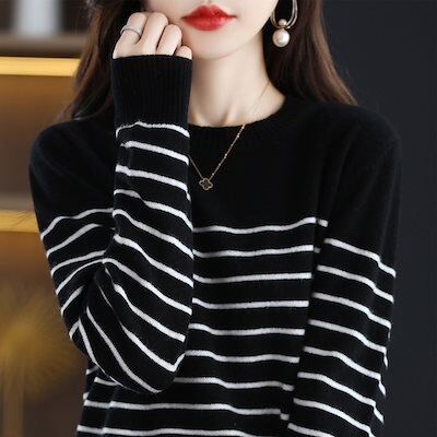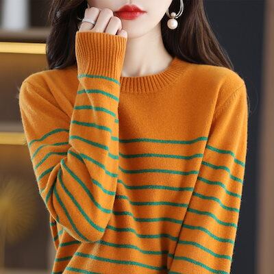 韓国ファッションレディース ベーシックニットラウンドネック気質インナージャンパーストライプ緩いニットボトムシャツ