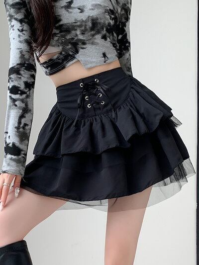 韓国ファッション プリーツスカート レディーススカートハイウエストメッシュブラックレースアップモデル JK制服ミニスカート