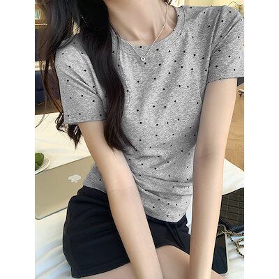 ヴィンテージラウンドネックデザイン半袖Tシャツ レディース 2024 夏 レディース 韓国製tシャツ 半袖 グレー水玉スクエアショルダートップス半袖