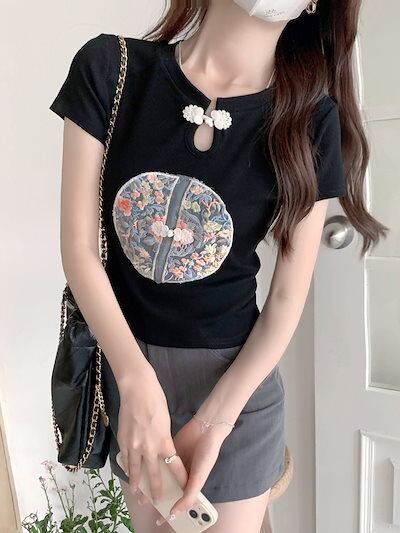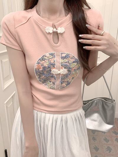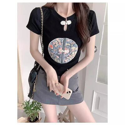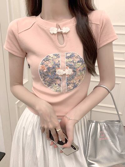 新中国風刺繍半袖Tシャツ 女性2024夏新作tシャツ 半袖 デザインセンスくり抜きポジティブショルダースリムショートトップス 半袖