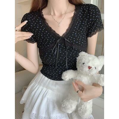 スリムストレッチ半袖の優しい感覚の韓国版tシャツ 半袖 レースリボントップス 半袖 Vネック露出鎖骨ブラウス女性の甘いセクシーな半袖Tシャツ