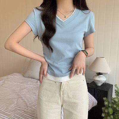 スレッドVネック半袖Tシャツ 女性の春と夏のボトムの無地スリム弾性tシャツ 半袖 偽のツーピース純粋な欲望の風の短いセクション薄いブラウストップス 半袖