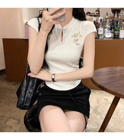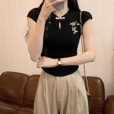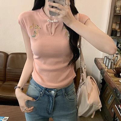 ナショナルスタイルの新しい中国のディスクバックル半袖Tシャツ 女性の夏の新しいデザインtシャツ 半袖 刺繍シワ加工ショートカットソートップス 半袖