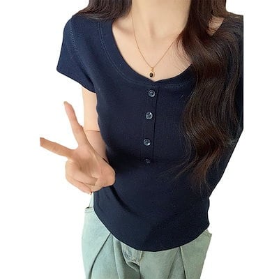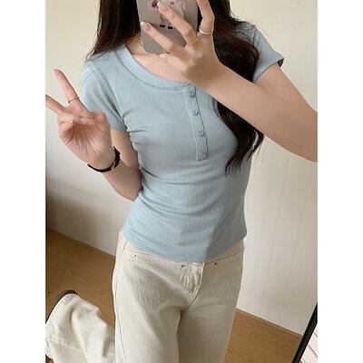 スレッドショルダーTシャツ 半袖 女性の春と夏の新しいデザイントップス 半袖 ハーフオープンカラーファッションスリムボトムシャツトップス