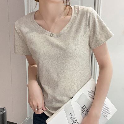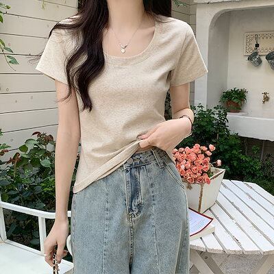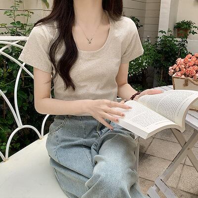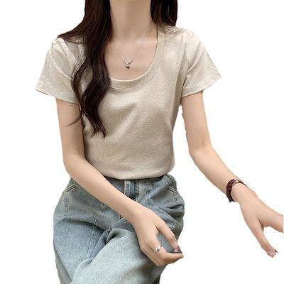Uカラーショート半袖Tシャツ レディース 2024夏新作tシャツ 半袖 スリムプルオーバーソリッドカラーベーシックモデル万能ポジティブショルダー薄手ハーフスリーブトップス