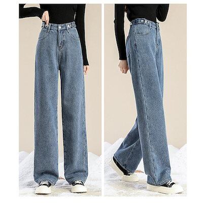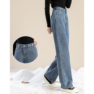 デニムパンツ レディース ワイドパンツ 裏起毛 裏ボア ジーンズ 厚手 ハイウエスト 秋冬 ジーパン 保温 防寒 暖かい ロングパンツ ゆったり 通勤