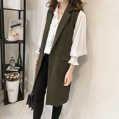 レイヤードトップススーツ ベスト カーディガン セミロング スリム見え 大サイズ ノースリーブ