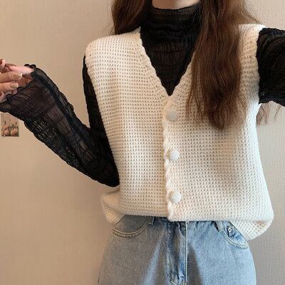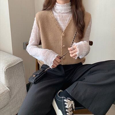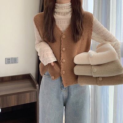 秋アウターレイヤードトップスニットベスト秋アウターベスト女Vネックのノースリーブカーディガン