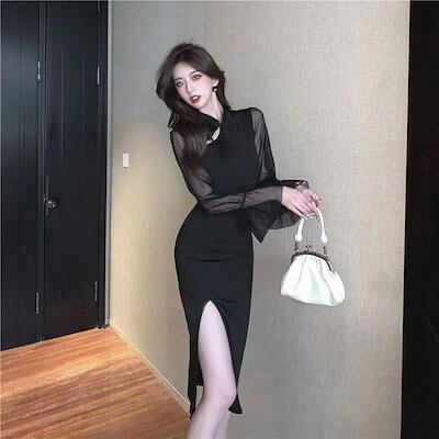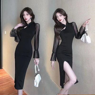 新作 改良 チャイナドレス ドレス 秋冬 長袖 タイトワンピース 着痩せ セクシー 修身 ブラック ロングワンピース