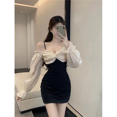 新品 切り替え キャミソール オフショルダーワンピース 着痩せ スリム見え 修身 長袖ワンピース パーティードレス替