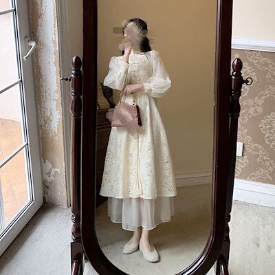 チャイナドレス 改良版 レディース パーティードレス エレガント 気質 長袖 ロングワンピース スカート 2点セット