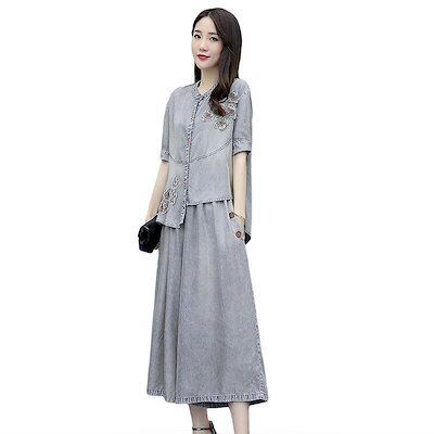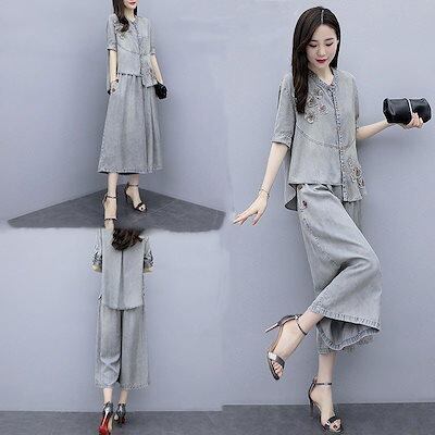 セットアップ レディース フォーマル 40代 デニム パンツドレス 刺繍 2点セット オフィス ラウ