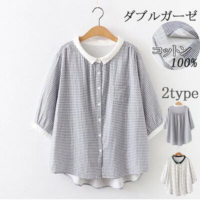 シャツブラウス レディース スタンドカラー シャツ ブラウス トップス フレンチスリーブ コットン100% 無地 白シャツ ストライプ チェック シンプル 大きいサイズ 体型カバー ゆったり 通勤 夏