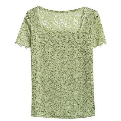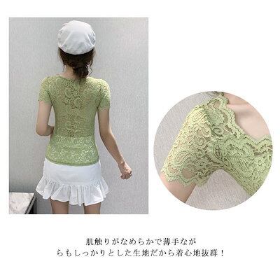 レディース トップス スクエアネック 半袖 レース 花柄 トップス 総レース 裏地付き カットソー 刺繍 トップス スリム インナー フェミニン ブ