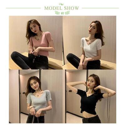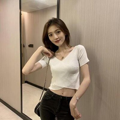 プルオーバー サマーニット カシュクール きれいめ カットソー vネック 半袖 セーター トップス クロス リブ編み 女性