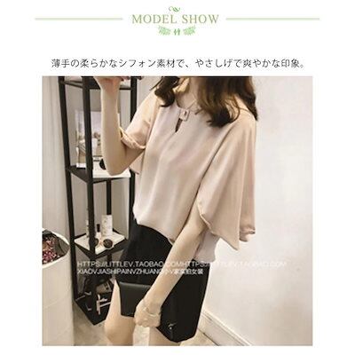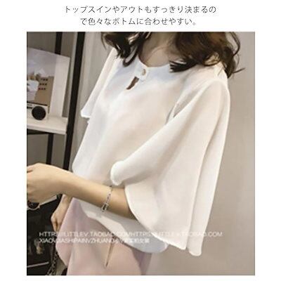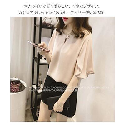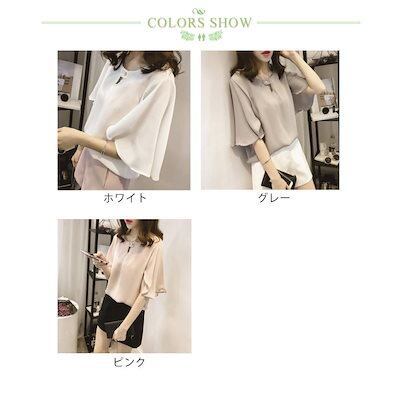 ノーカラー 無地 シャツブラウス ブラウス カットソー フレア袖 半袖 ブラウス ノーカラー 5分袖 シフォン シャツブラウス フリルブラウス きれ