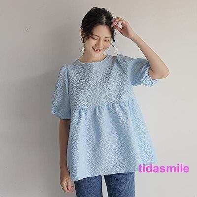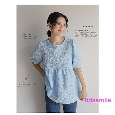 カットソー レディース ブラウス Tシャツ 半袖 tシャツ パフスリーブ エンボス加工 ペプラム バッグリボン トップス 夏服 着痩せ おしゃれ