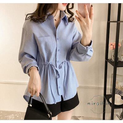 高級な質感 シャツ レディース 長袖 綿混紡 大人 秋 春 トップス 20代 30代 40代 50代 ママ 母 OL 羽織り 前開き 韓国ファッション ドロスト 紐 ラウンド裾 無地