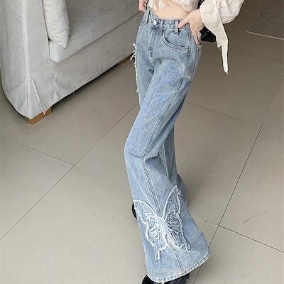 大人気 デニムパンツ 秋 新作 ハイウエスト フリンジ ボトムス レッグ ゆるダボ ゆったり カジュアル ストリート 切りっぱなしカットオフ 加工 肌見せ ジーパン レディース 脚長効果 美脚効果